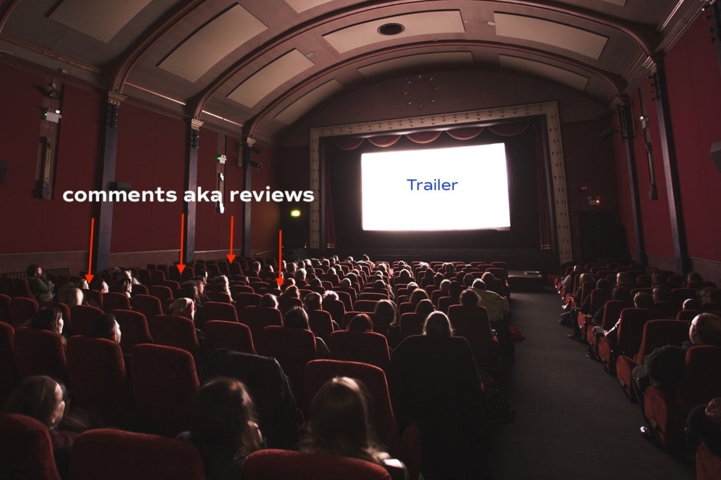 Going over the user interview notes, I found the idea of a trailer of a movie and comments together to be really insightful. It led me to think of an experience like a movie theatre. You can watch the trailer and read the reviews similar to how in a movie theatre that is (potentially) packed, you can hear what people think of the 30-60 second preview of the next Marvel movie, hear their laughter and either agree or disagree.