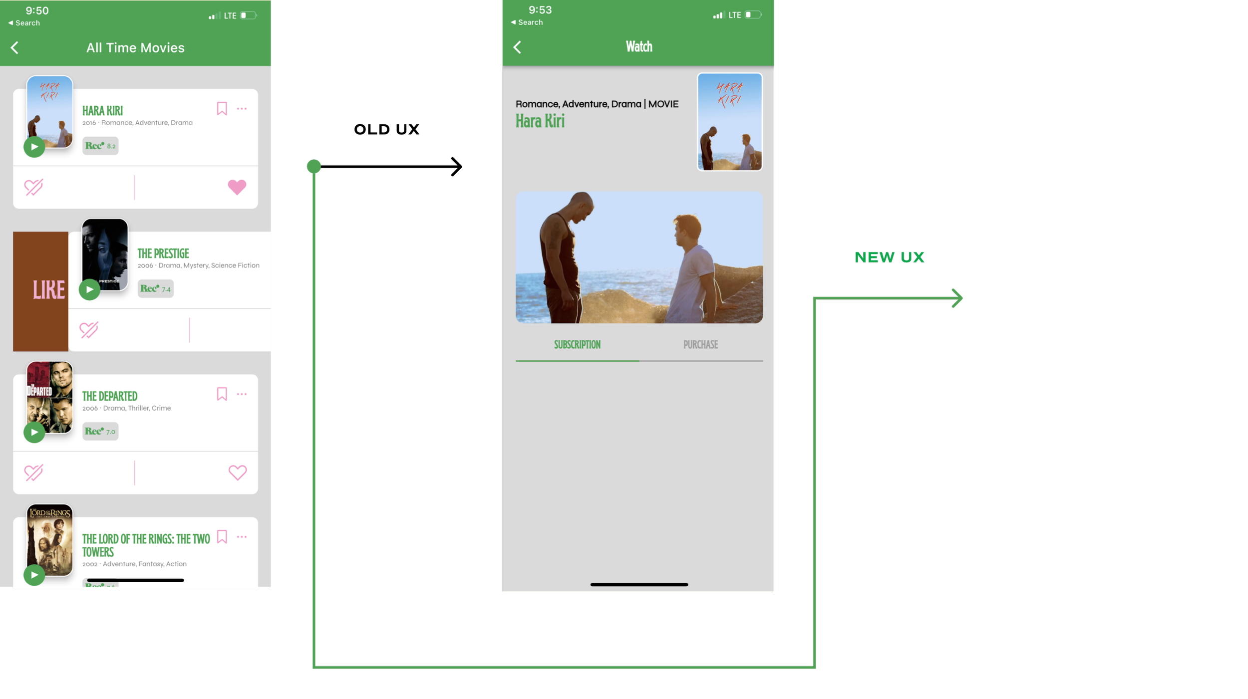 I embarked on an updated design where the content details screen was not only connected to the Activity Feed for users to view and rate content but also the Discover screen where users are more likely to find more content to interact with than the Activity Feed.